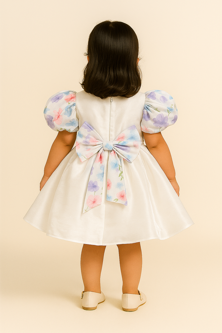 A stunning floral fantasy for your little one! This puff-sleeved dress features vibrant multicolor floral embroidery on a soft off-white base.