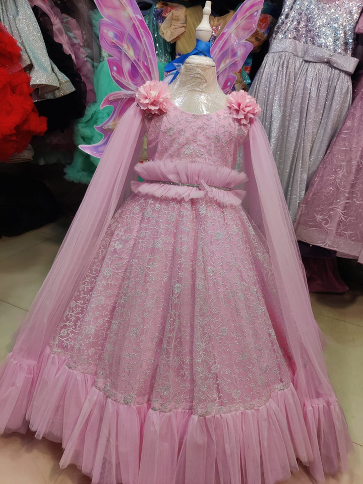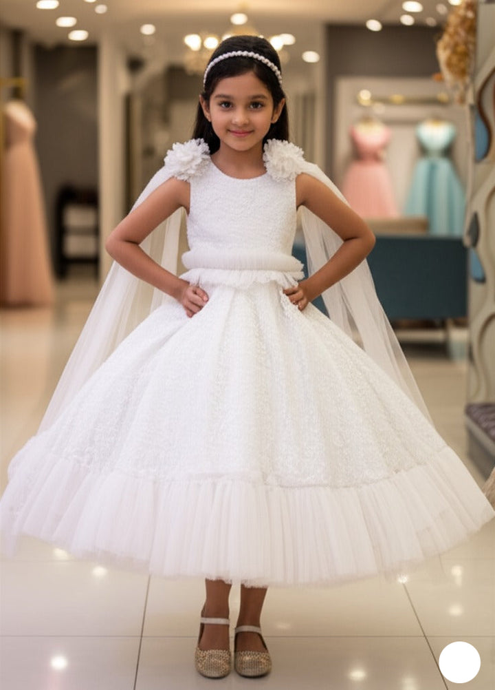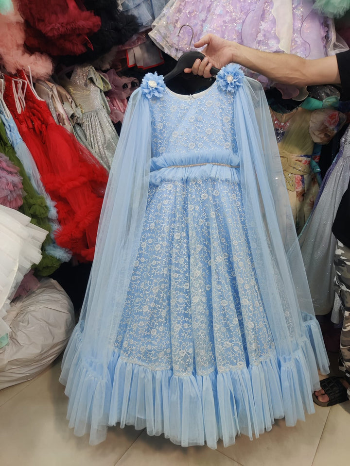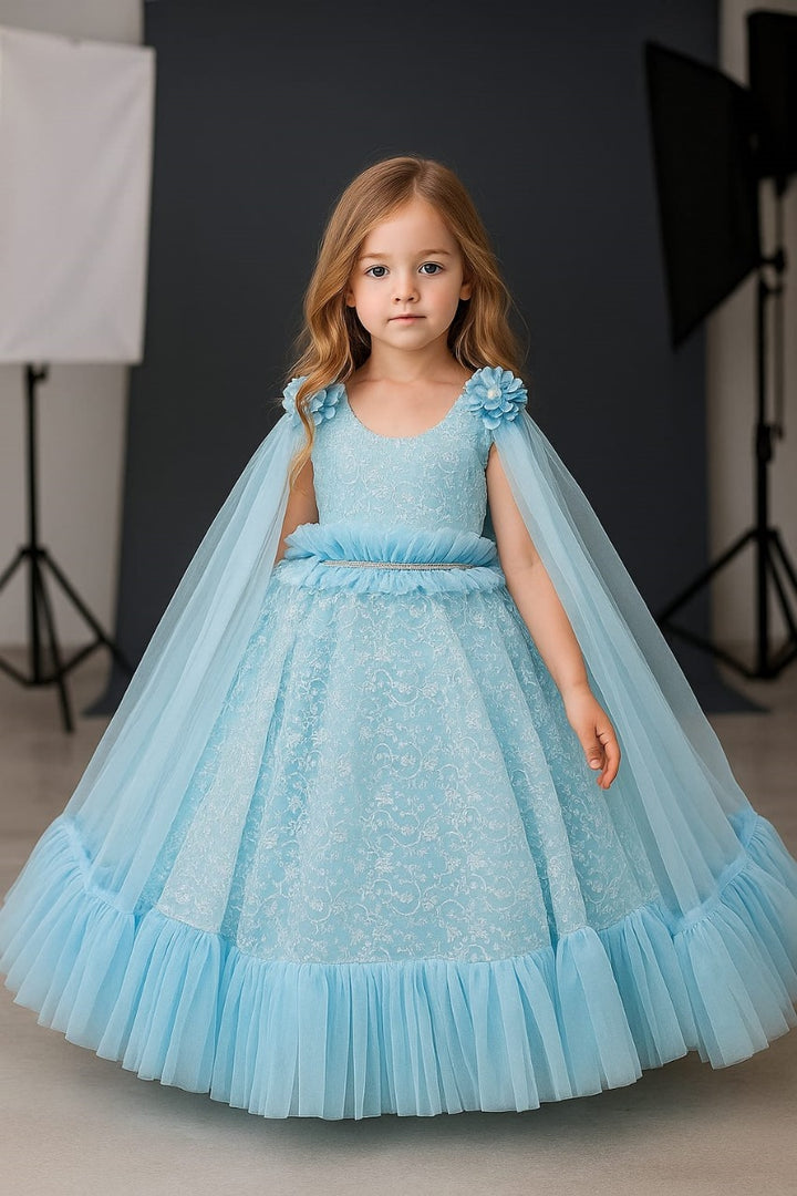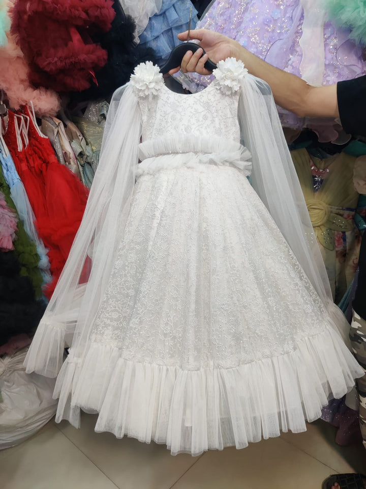 This formal dress features delicate white floral embroidery on premium net fabric, a pleated hemline for added flair, and dreamy cape-style sleeves flowing gracefully from the shoulders. The soft tulle waist detail and 3D floral appliqué give it a regal charm, making it perfect for weddings, birthdays, formal events, or any magical moment.